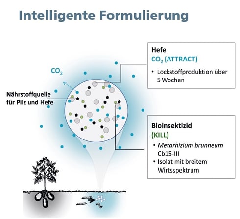 Hefezellen als Lockstoffquelle und der im Boden natürlich vorkommende, für Drahtwürmer tödliche Pilz Metarhizium brunneum. Nach Wasseraufnahme im Boden beginnt die Lockstoffproduktion ebenso wie das Wachstum des Pilzmycels aus dem Granulat heraus. Die durch das CO2 angelockten Drahtwürmer werden bei Kontakt mit den Pilzsporen infiziert und sterben nach einigen Tagen ab.